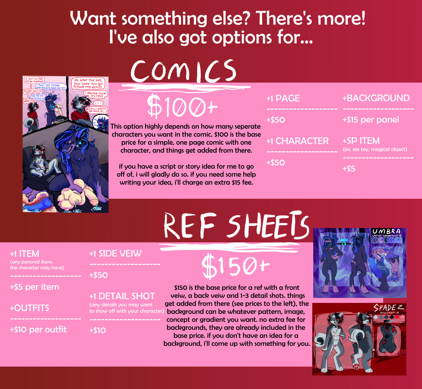 once you're done, look through these options and dm me on bluesky, twitter or discord! (user @concupicentquadrantz !!) we can discuss other options if you have anything other than what's listed in mind :3